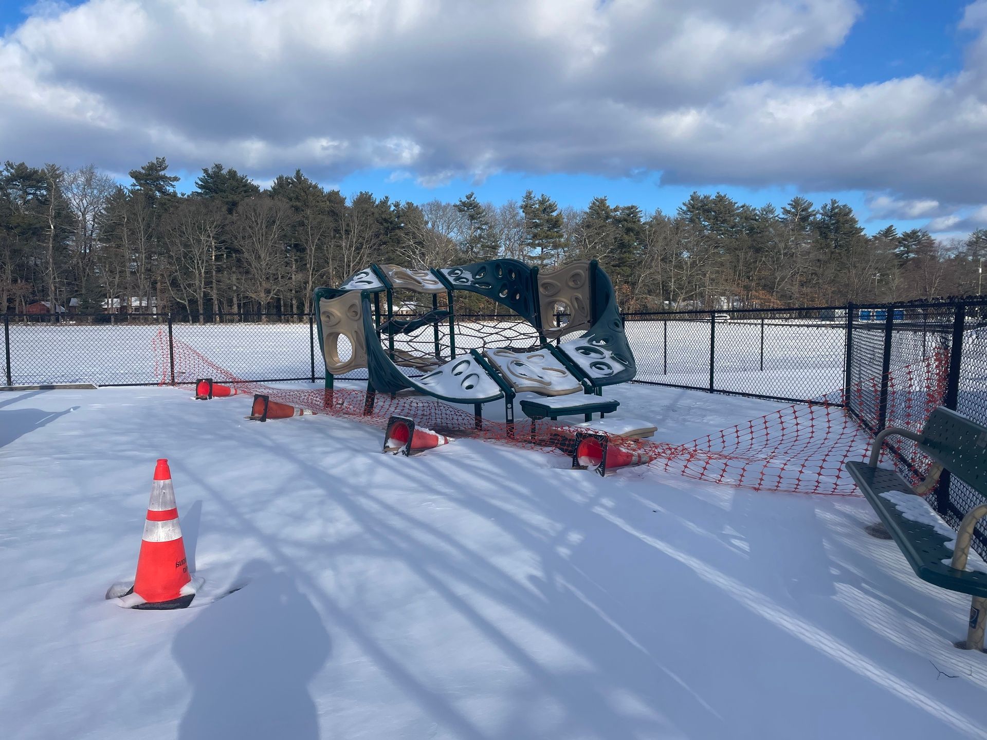 While that application is working its way through the Community Preservation Committee’s vetting process, the Town has announced that portions of the new poured rubber surface fall short of safety standards and have been roped off. “Recent review determined that these areas do not currently meet required safety standards for fall protection.”